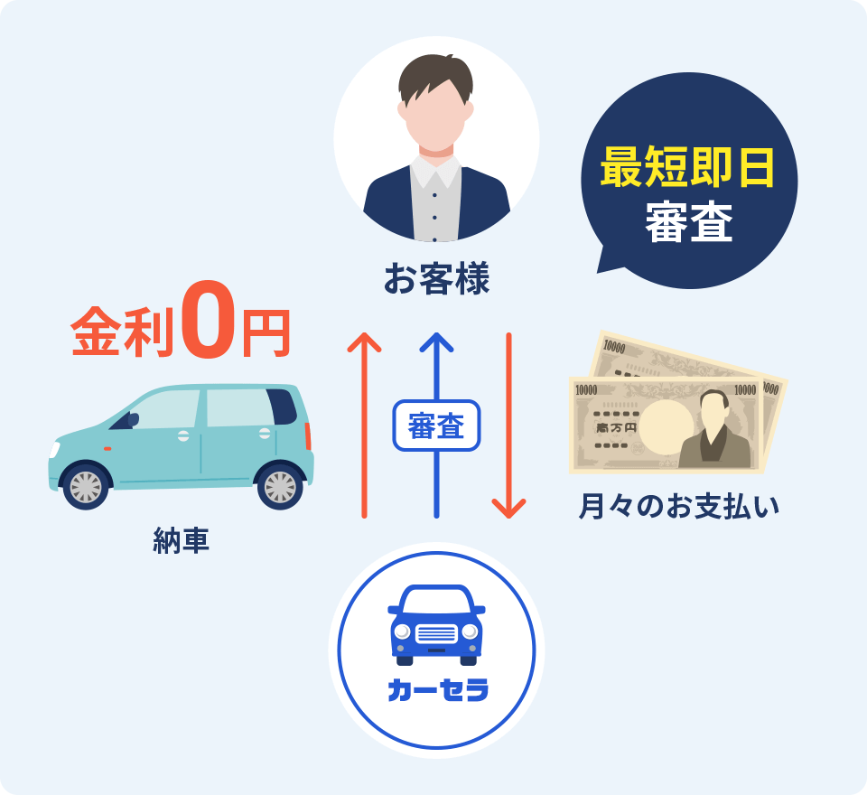 一方、当社の自社ローンではお店とお客様との直接契約となりますので、他社のローン審査が通らなかった方でもご利用いただけます。現在までの他社の借り入れ状況などは考慮しませんので、審査の通過率も高く、どのような方にも安心してご契約いただけるプランとなります。